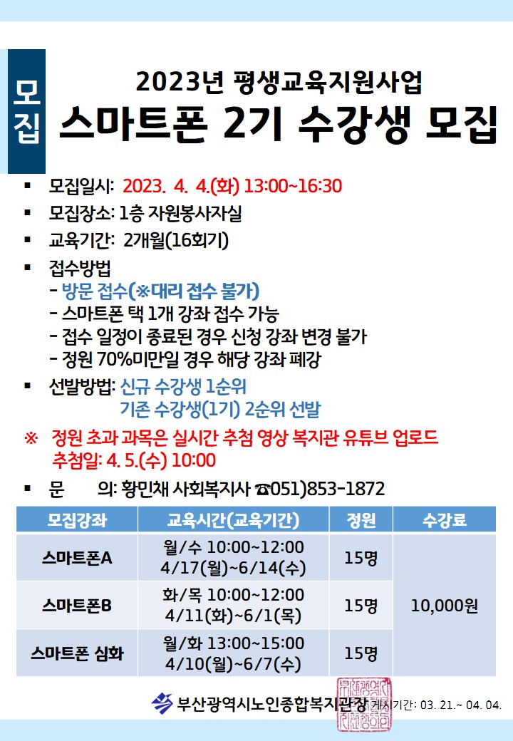 모집 2023년 평생교육지원사업 스마트폰 2기 수강생 모집 페이지 정보 작성자 관리자 작성일 23-03-21 15:32 조회 7,273회 댓글 0건 본문 이전글'스마트 시니어 봉사단' 참여자 모집 다음글4월 영화상영 안내 목록