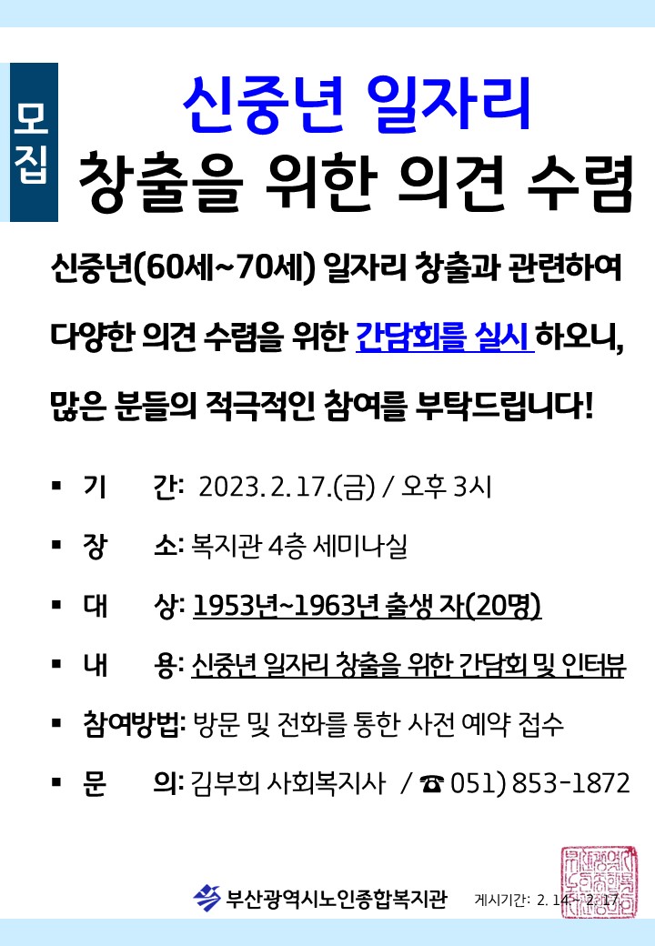 모집 신중년 일자리 창출을 위한 의견 수렴 페이지 정보 작성자 관리자 작성일 23-02-16 11:58 조회 7,253회 댓글 0건 본문 이전글상담자원봉사자 모집 다음글노인일자리 구상사업 발굴 공모전 우수상 수상 목록