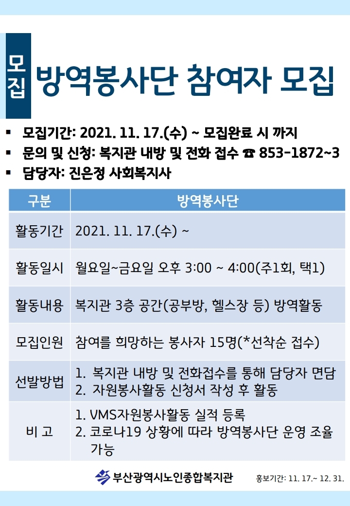 모집 방역봉사단 참여자 모집 페이지 정보 작성자 관리자 작성일 21-11-18 14:28 조회 11,229회 댓글 0건 본문 이전글[금요 건강정보] 집에서 가볍게 운동하는 시니어 홈트레이닝 다음글2021년 제1회 추가경정예산 게시 공고(복지관, 재가노인지원서비스센터, 장기요양기관) 목록