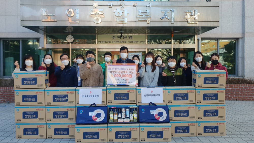 2021년 한국주택금융공사와 함께하는 설맞이 선물세트 나눔 페이지 정보 작성자 관리자 작성일 21-02-08 08:44 조회 3,024회 댓글 0건 본문 1. 행사명: 2021년 한국주택금융공사와 함께하는 설맞이 선물세트 나눔2. 일자: 2021. 2. 8.(월) 3. 내용: 한국주택금융공사에서 지역 내 어르신들이 풍성한 새해를 보내실 수 있도록 500만원 상당의 선물세트를 후원해주셨습니다. 후원받은 선물세트는 지역 내 어르신들에게 잘 전달하도록 하겠습니다~! 다시 한번 감사의 인사를 전합니다. 감사합니다^^ 이전글한국국토정보공사(LX)부산울산지역본부 설맞이 온누리상품권 후원 다음글2021년 재가노인지원서비스센터 대상자 '훈훈한 겨울나기' 후원품 지원 목록