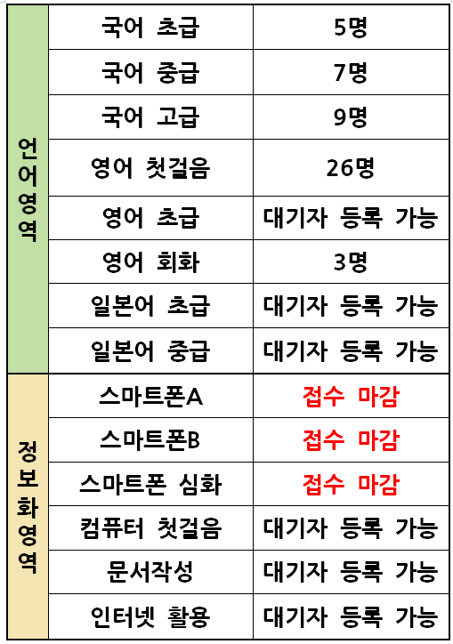 발표 2025년 상반기 평생교육 및 취미여가지원사업 프로그램 추가접수 안내 페이지 정보 작성자 관리자 작성일 25-01-20 17:44 조회 4,186회 댓글 0건 본문 이전글2025 상반기 시니어 튼튼 체육교실 참여자 모집 다음글2025년 상반기 평생교육프로그램 수강생 당첨자 발표 목록