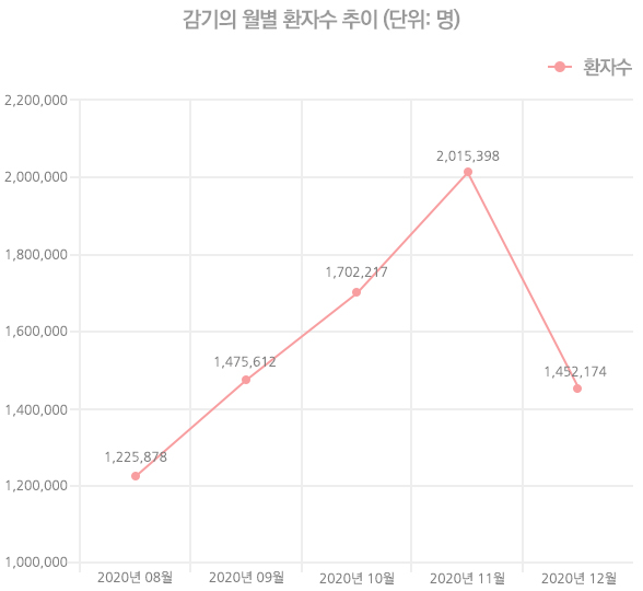 건강보험심사평가원의 보건의료빅데이터개방시스템의 의료통계정보를 살펴보면 여름을 지나 가을로 접어들면서 감기 환자가 늘어나고, 피부건조증 환자 역시 증가하는 것을 월별 그래프를 통해 확인할 수 있다.