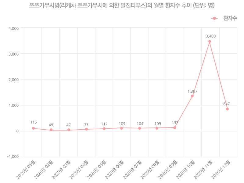 우리나라에서 쯔쯔가무시병을 매개하는 주된 진드기인 대잎털진드기는 주로 9월에 유충이 나타나기 시작해 10월과 11월 그 수가 정점에 달하는 것으로 알려져 있다. 이로 인해 해마다 가을만 되면 환자가 급증하는 그래프를 보인다.