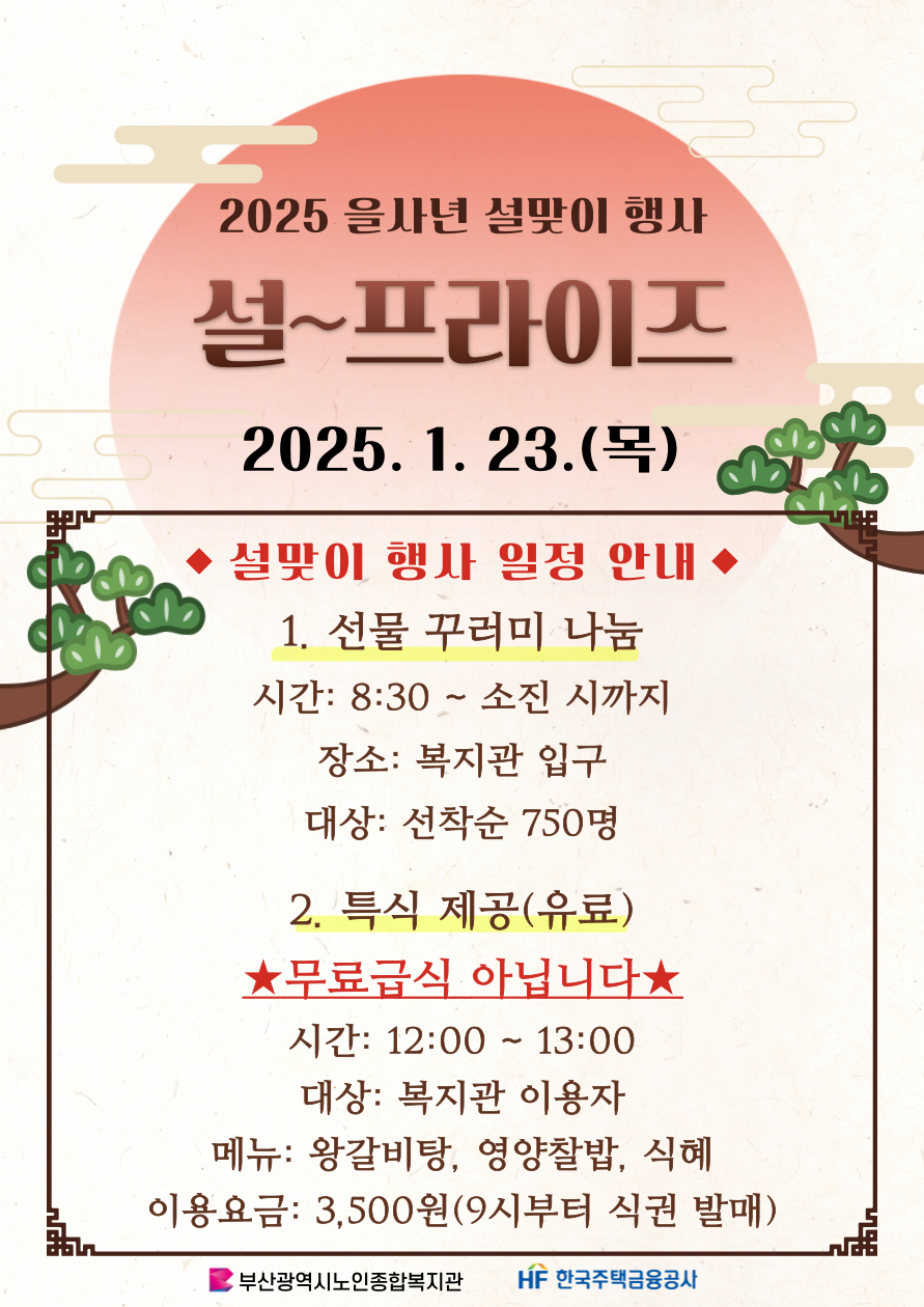공지 2025년 설맞이 행사 '설~프라이즈' 페이지 정보 작성자 관리자 작성일 25-01-16 20:05 조회 3,828회 댓글 0건 본문 이전글안전한 금전 거래를 위한 법률 특강 참여자 모집 다음글설날 및 임시공휴일 휴관 안내 검색 목록