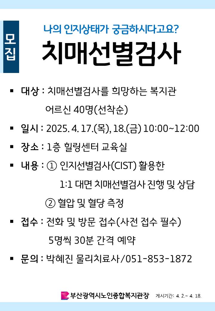 모집 치매선별검사 참여자 모집 페이지 정보 작성자 관리자 작성일 25-04-02 10:50 조회 3,118회 댓글 0건 본문 이전글[노인권익] 노인학대 예방 교육 참여자 모집 다음글2025년 제1차 추경예산 공고(노인복지관, 장기요양기관) 목록